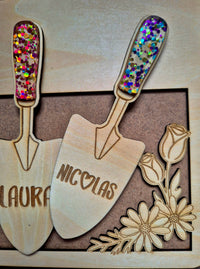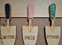 Chaque truelle porte un prénom personnalisé, transformant ce tableau en souvenir unique et profondément touchant.